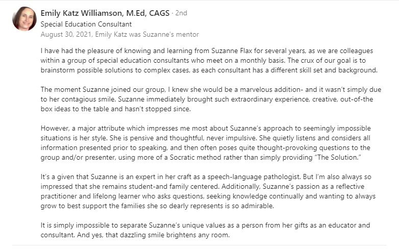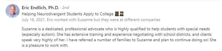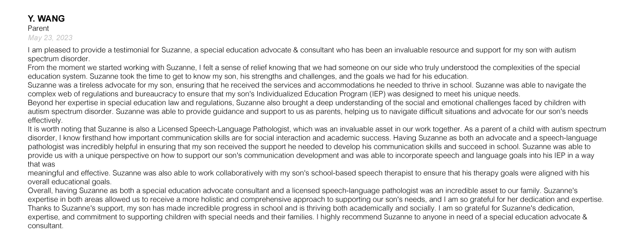I graduated from Columbia University with a Master of Science in speech-language pathology and have 30+ years of experience as an advocate/consultant for students with diverse special education needs from preschool to age 22.